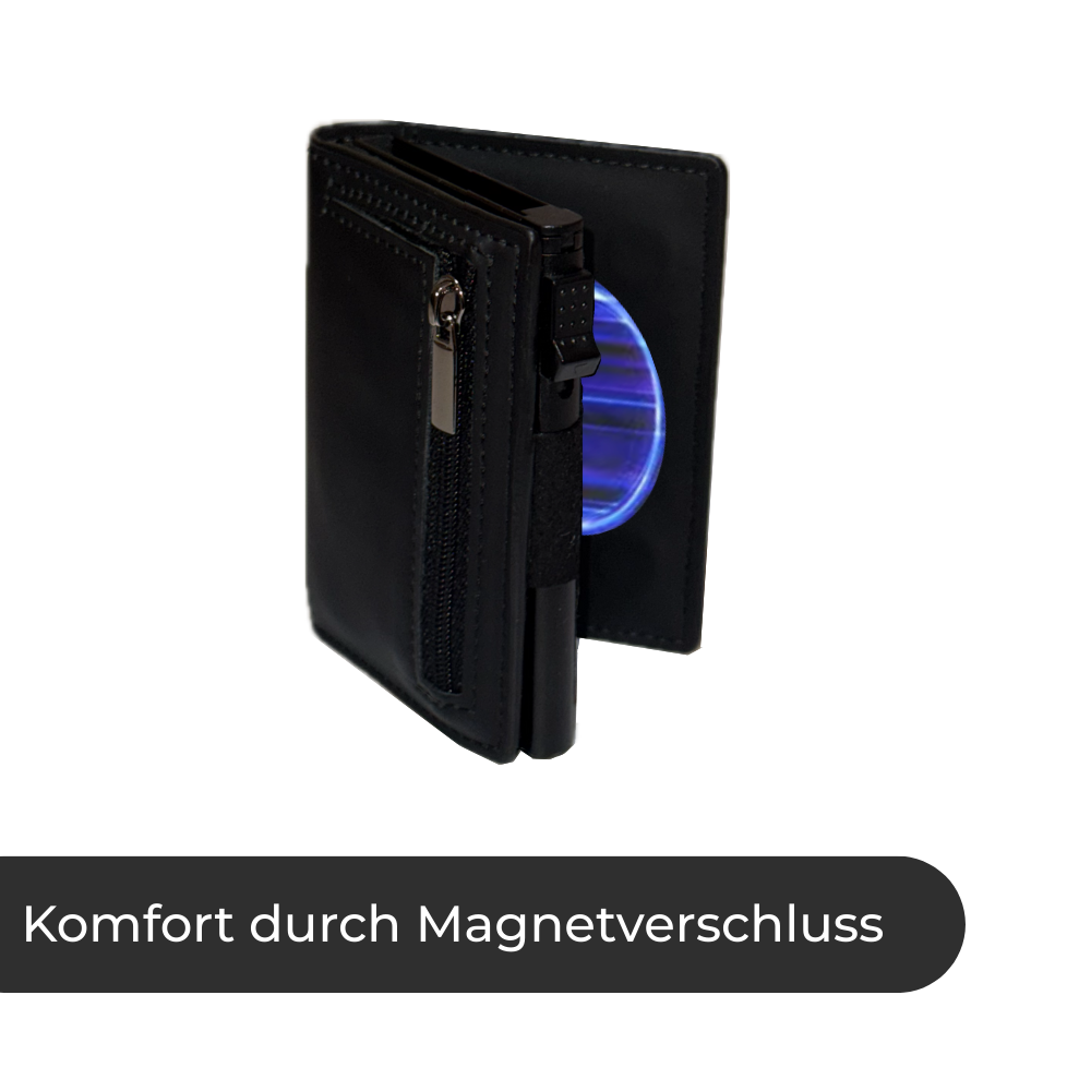 Der unsichtbare Magnetverschluss hält das Wallet zuverlässig geschlossen, auch bei Bewegung. Dennoch kannst du es jederzeit bequem und schnell öffnen.