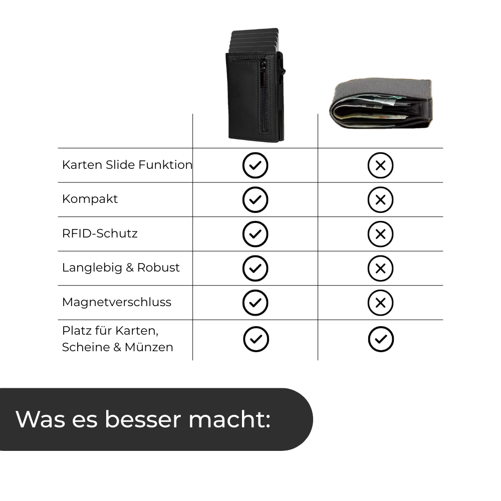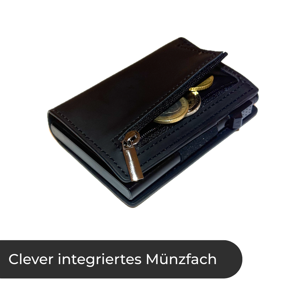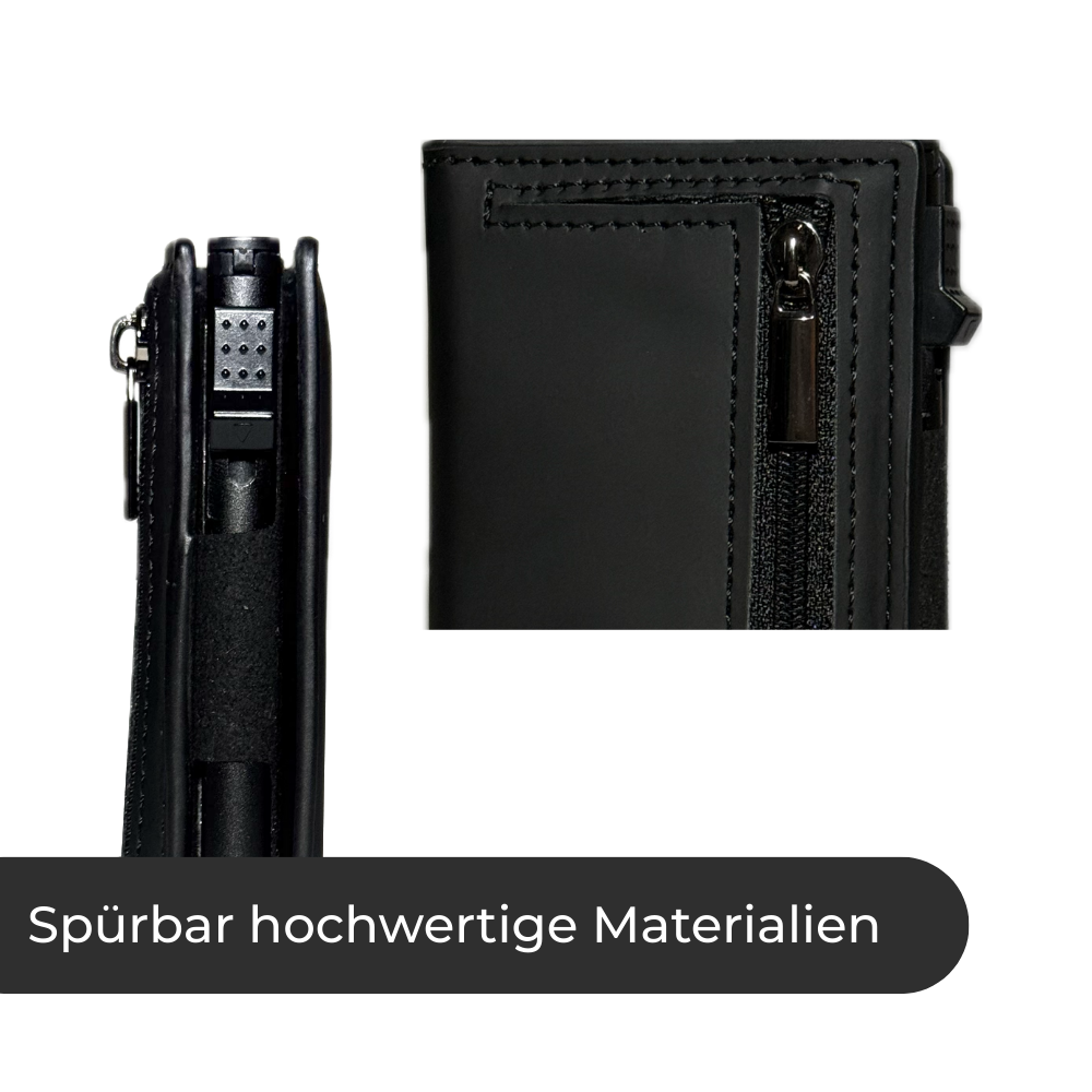 Ein Druck und deine Karten gleiten perfekt sortiert heraus. Kein Gefummel, kein Chaos, kein peinliches Suchen mehr. Die Slide-Funktion arbeitet jedes mal präzise, leise und zuverlässig. So bist du beim Bezahlen immer der, der den Überblick und die Kontrolle hat.